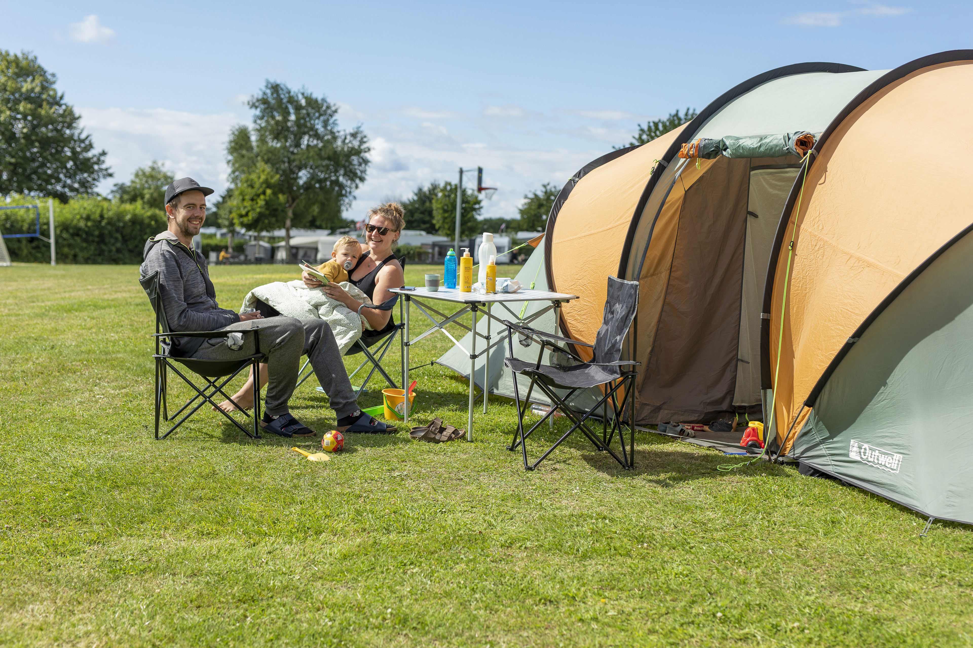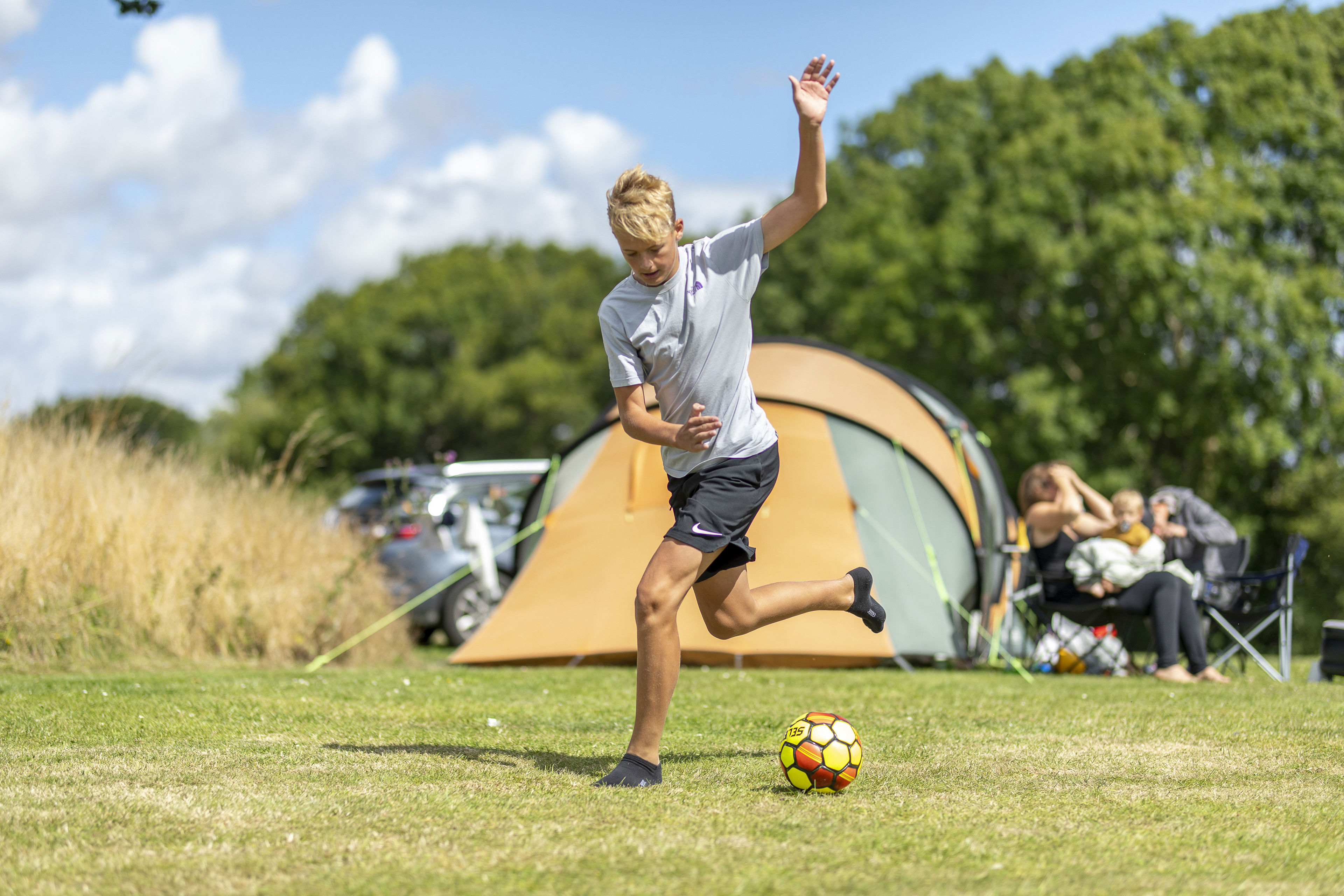 Du kan også pakke teltet og soveposen og booke en plads (uden strøm) ved Kæmpehøjen, en smuk gravhøj midt på vores store teltplads, hvor du frit kan vælge hvor du vil sætte dit telt op. Teltområdet ligger lige bag poolområdet og den nye poolservicebygning med bade- og toiletfaciliteter, inde- og udekøkken, grill, overdækkede siddepladser samt vaskeri.