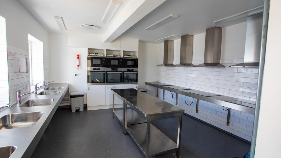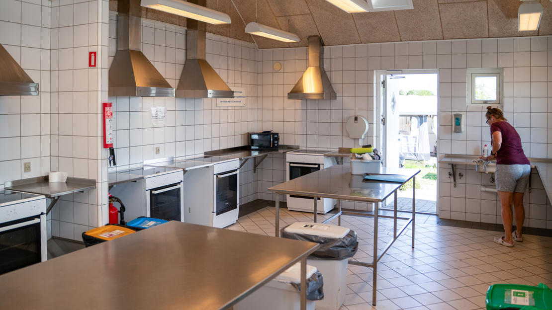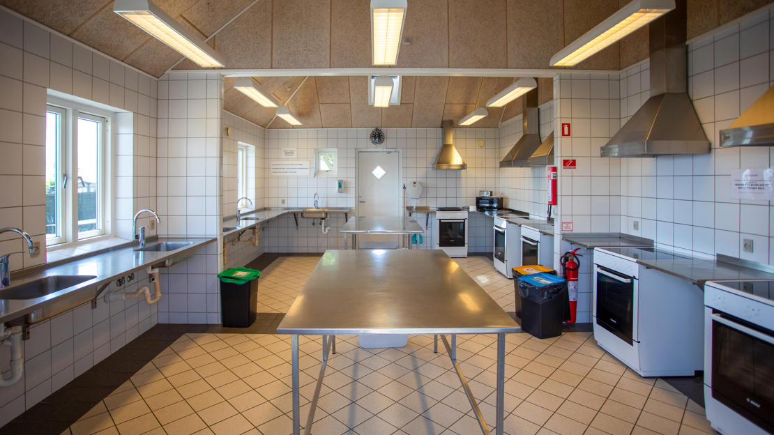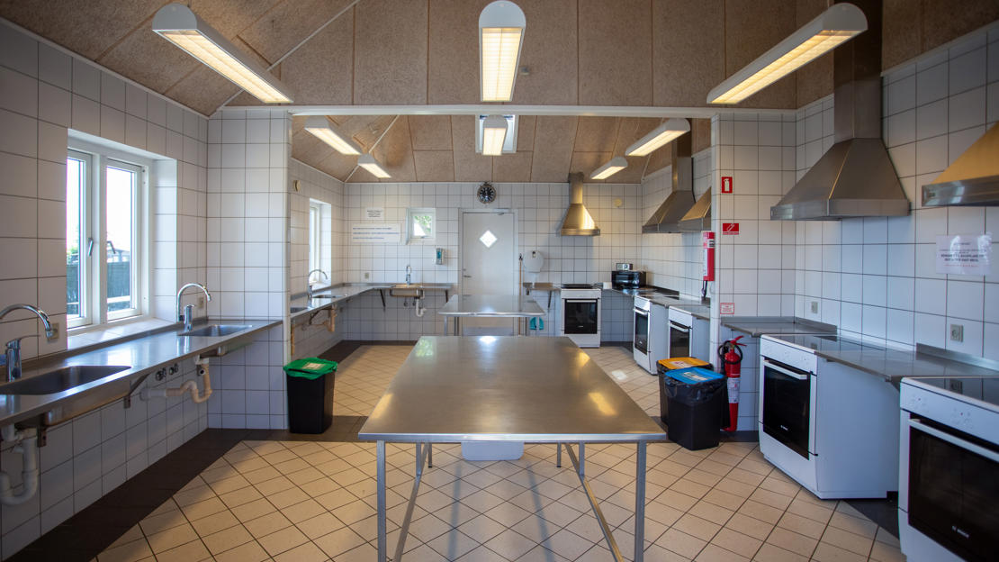 Unsere Gemeinschaftsküchen sind mit mehreren Herden, Kochplatten und Handwaschbecken ausgestattet – es gibt ausreichend Platz für mehrere Familien gleichzeitig. Unsere eine Küche befindet sich an der Ecke von Vibevej und Bøgevej, die andere im neu renovierten Poolhaus.