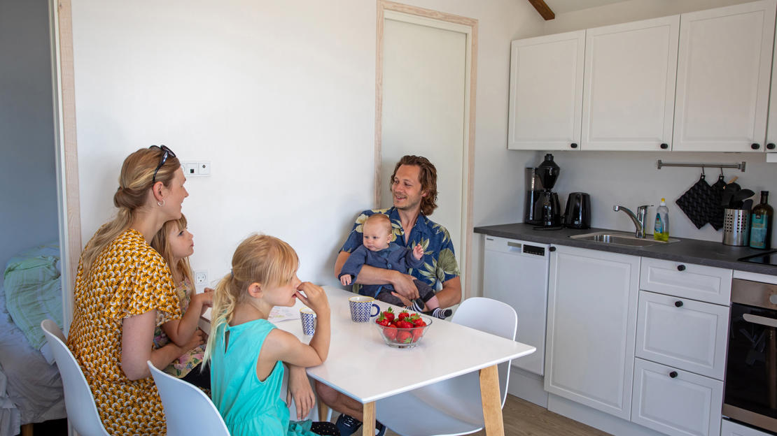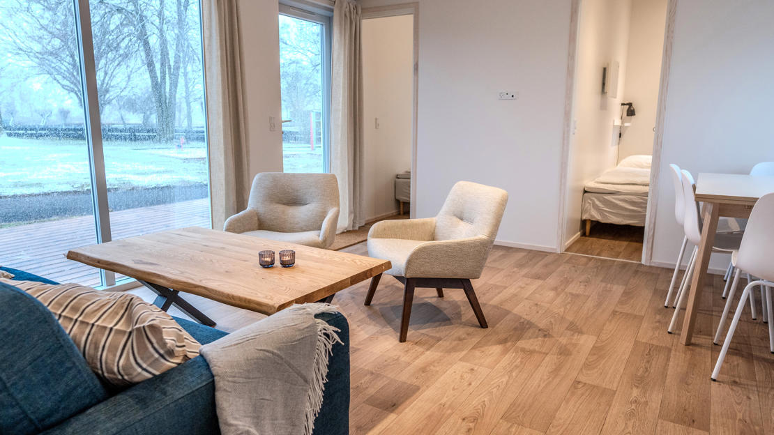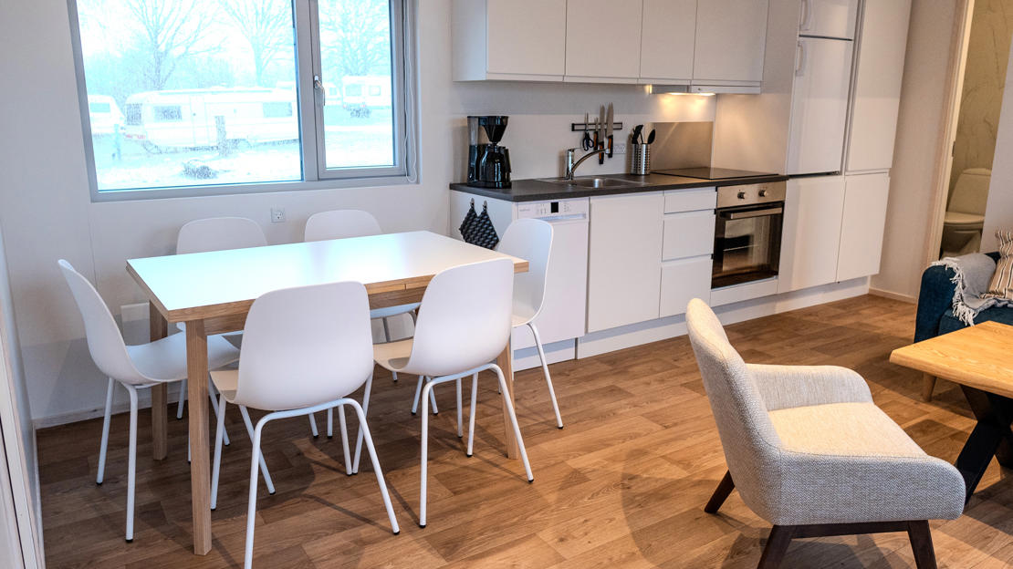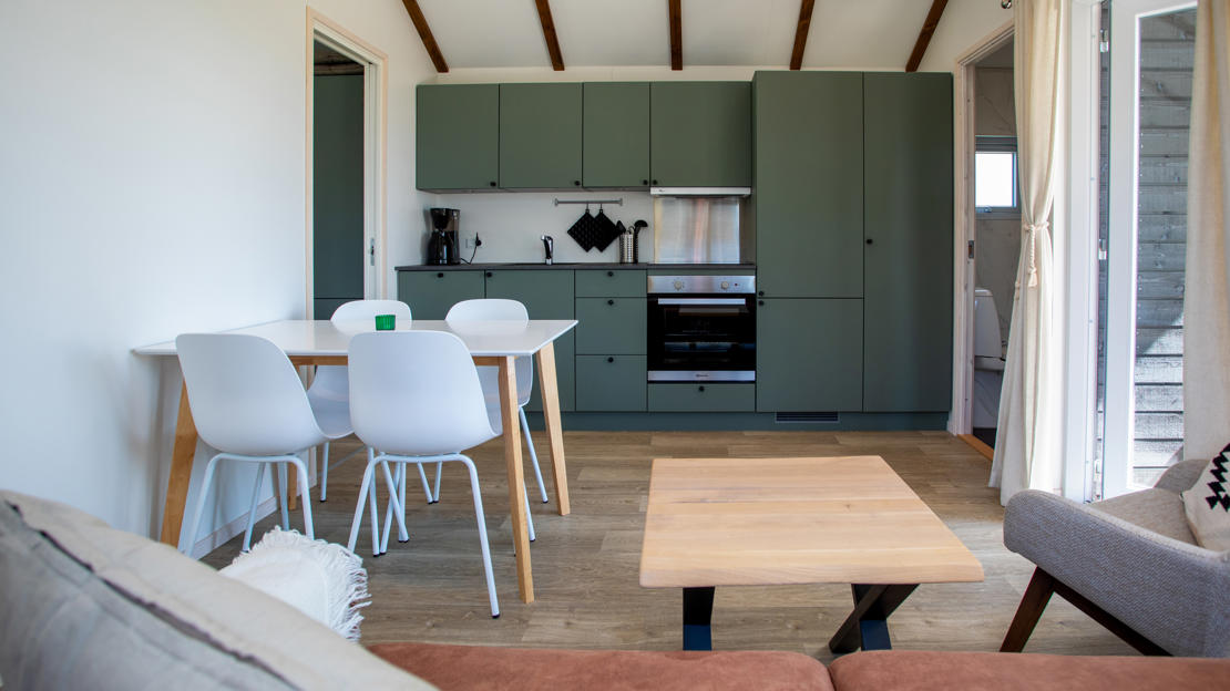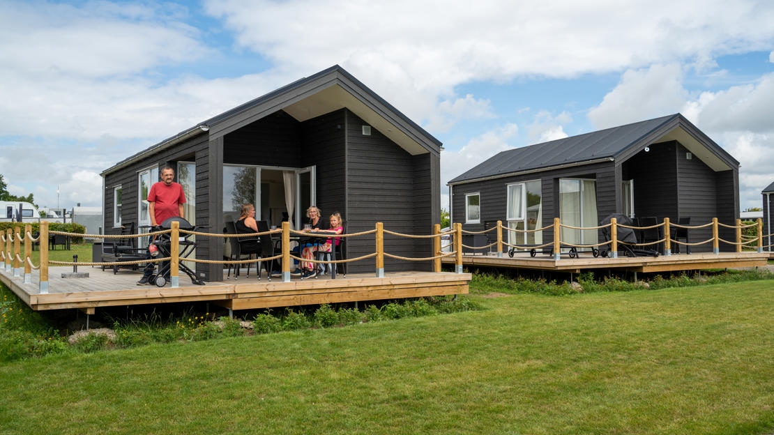 Book a holiday home with plenty of space for the whole family! Our Swan cabins offer 6 sleeping spaces, a large kitchen/living area, and a lovely terrace where you can keep an eye on the kids playing in the green area.