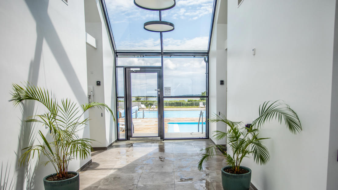 The pool building now features new shower and toilet facilities, along with a large glass-covered atrium with skylights. The building also houses a new kitchen and outdoor kitchen with a spacious covered terrace featuring tables and benches, accommodating many people.